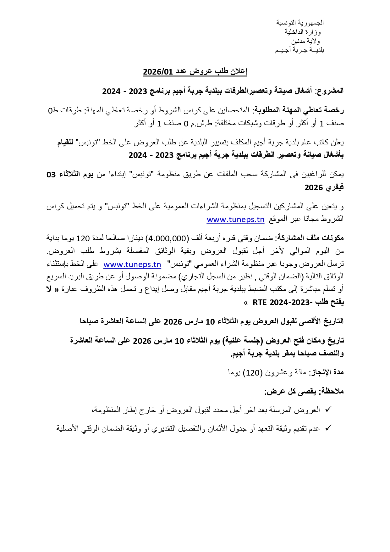 اعلان طلب عروض عدد 01/2026